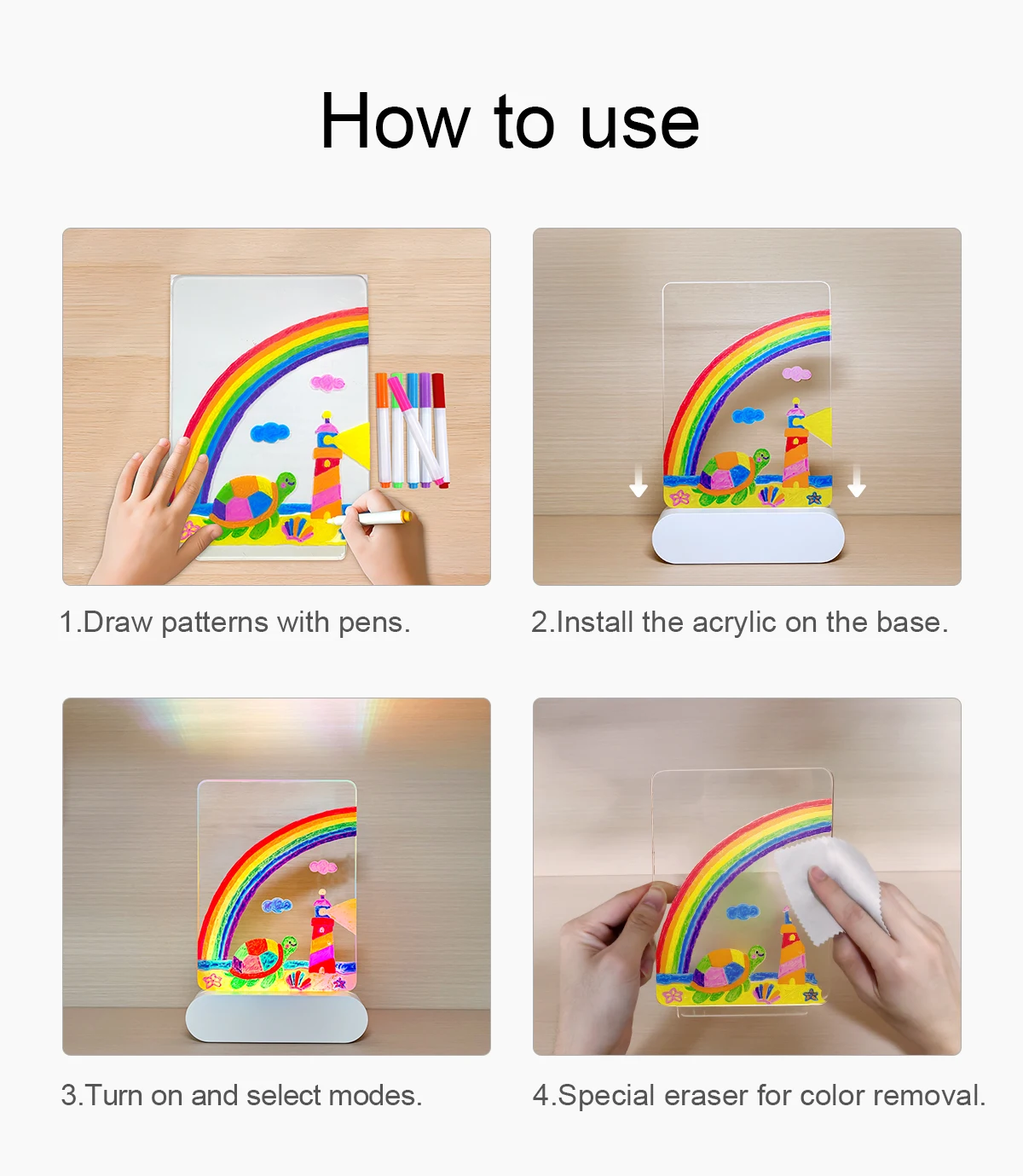 Met de LED DrawingLight maak je van elke muur een levendig kunstwerk. De lamp verlicht de ruimte en stimuleert de creativiteit van kinderen, waardoor ze eindeloos kunnen tekenen, schrijven en spelen.